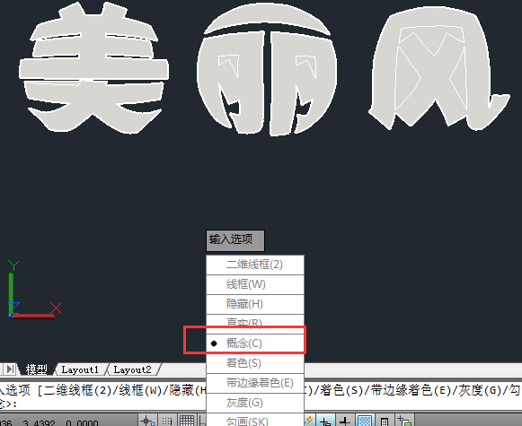 7.sha——空格——C(概念视图),这时看到字的笔画是有些是连在一起的,就需要将其它多余的笔画去掉