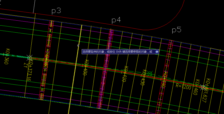 8.删除等分线。输入命令“ex”延伸来把刚刚得到的扇形直线贯穿路面。