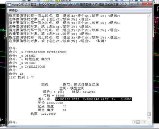 2.打开cad图纸。在图中找到曲线段。选中道路中心曲线,输入命令“list”,即可得到曲线段的圆心坐标。