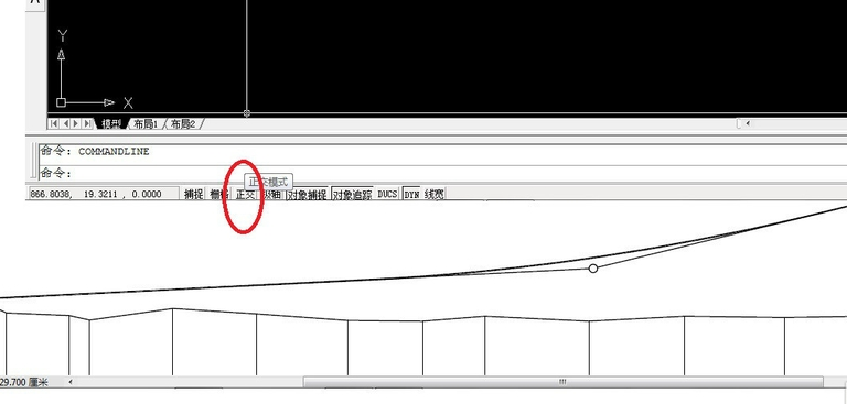 2.打开cad,在下侧的命令栏中中,找到正交,并打开正交。