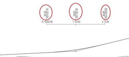 1.打开曲线的设计图纸,找到曲线的要素。取曲线上的三个点的里程和现对标高,并计算其相对标高和相对里程。如图所示,假设第一个点的里程跟标高为0,则第二点的里程为53.63,标高为0.53,第三点为107.5,标高为1.59.