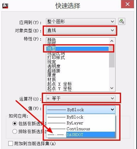 6.对象类型选择直线,特性选择线型,运算行选择=,值选择我们刚刚看到的那个线型,单击确定