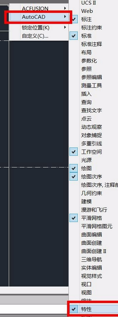 3.选择CAD软件边框右键点击,选择Auto CAD 再选择特性,这样特性栏就出来了,拖到自己习惯使用的地方,我的是放在顶部