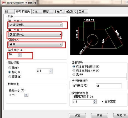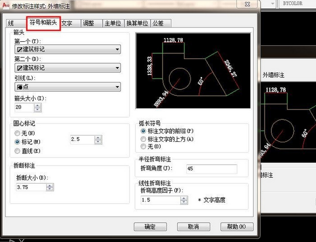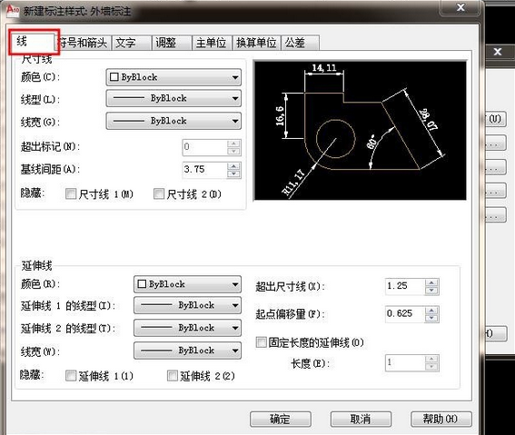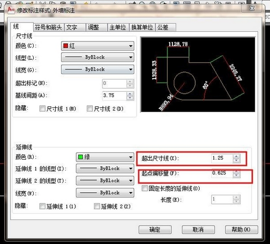8.超出尺寸线和七点便宜量一般默认,也可修改。如图: