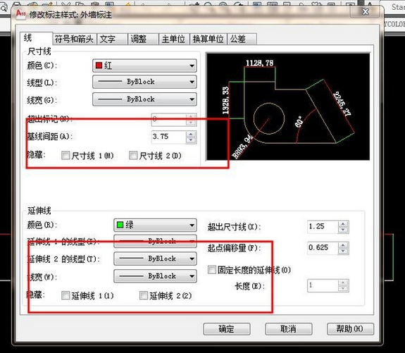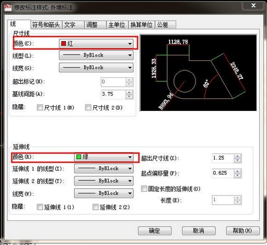 7.修改尺寸线和延伸线的颜色。如图: