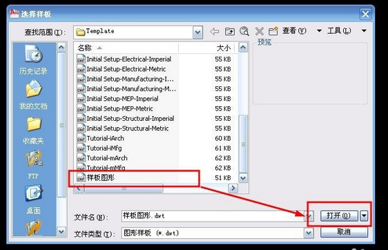 12.在弹出的对话框里选择“样板图形”打开,如图: