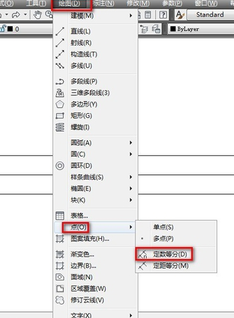 3.点击菜单栏中的“绘图”→“点”→“定数等分”,此时系统提示“选择要定数等分的对象:”选择刚才你画的辅助线,“输入线段数目或[块(B)]:”输入6。如图所示。