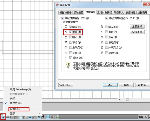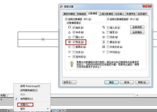 6.在捕捉模式中,点击鼠标的右键,选择设置,在出现的“草图设置”对话框的“对象捕捉”中的“节点”,然后点击确定,这有打开节点捕捉才能接着下一步。如图所示