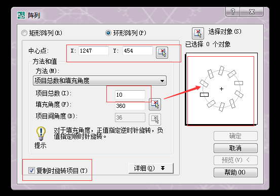 3.阵列的参数面板中,可在【中心点】中设置环形阵列的半径,【项目总数】也就是需要组成环形阵列七边形的数量。