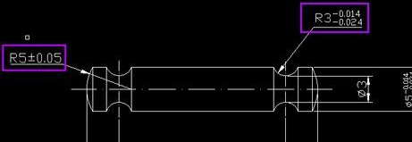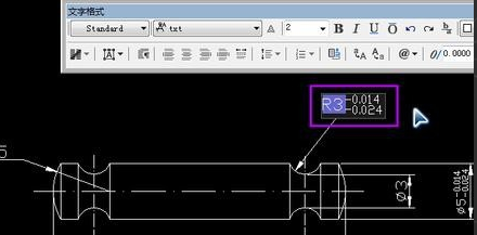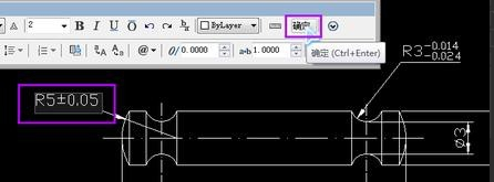 10.用类似的方法再修改一个R5那个数值,这里增加一个对称公差。先选中R5,然后键盘按“ED空格”(英文输入法状态下),弹出文字格式窗口,在R5后面输入“%%p0.05”,“%%p”会一下子变成“±”这样刚才输入的“0.05”就变成了所需要的对称公差,然后点击窗口的“确定”就OK了。
