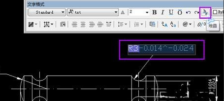 8.比较方便的标注公差:鼠标选中你要标注公差的标注,然后键盘按“ED空格”(英文输入法状态下),然后会出现一个“文字格式”窗口,如图所示输入想要标注的上下公差数值,然后用鼠标选中上下公差数值,然后点击窗口上的“b/a”堆叠的按钮