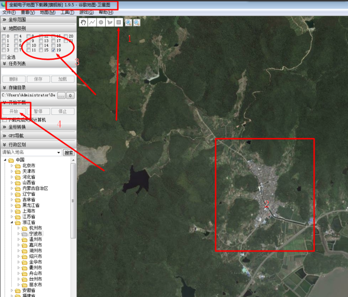 1.使用谷歌卫星截图软件,下载地形图所在的卫星图,软件可以百度查询,这里仅作参考,如使用图中软件请按照1--4顺序操作;