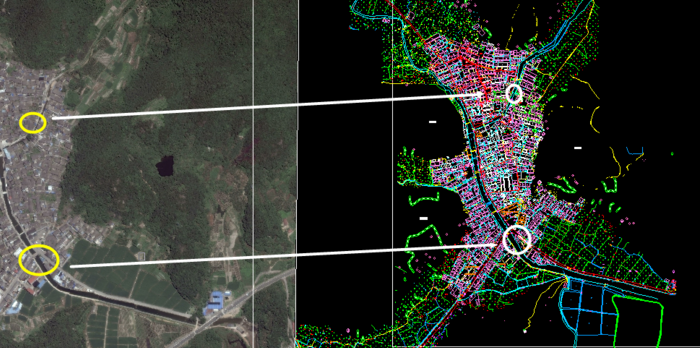 4.使用【dr】命令,将卫星图置入地形图下方,在观察图片与地形图偏差如何,在重复步骤3,进行微调;