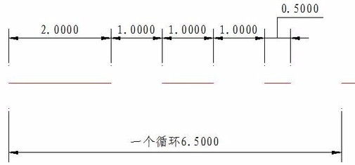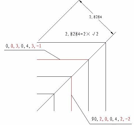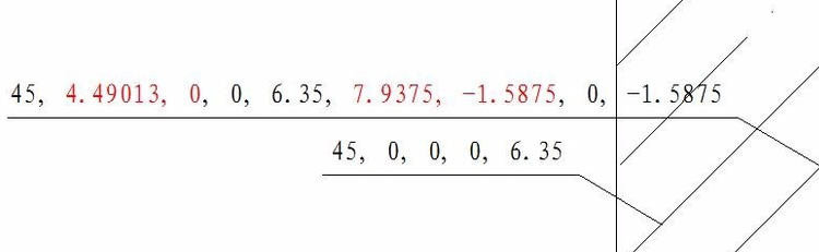 第二行为图案的描述行。可以有一行或多行。其含义分别为:直线绘制的角度,填充直线族中的一条直线所经过的点的X、Y轴坐标,两填充直线间的位移量,两填充直线的垂直间距,dash-n为一条直线的长度参数,可取正负值或为零,取正值表示该长度段为实线,取负值表示该段为留空,取零则画点。如下图dash-n的n取6,需要6个数据才能描述该段线