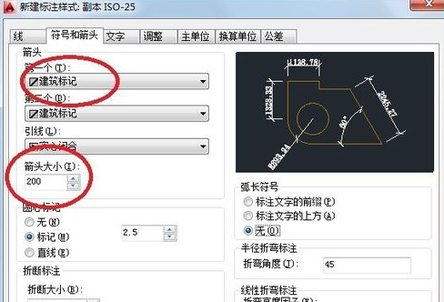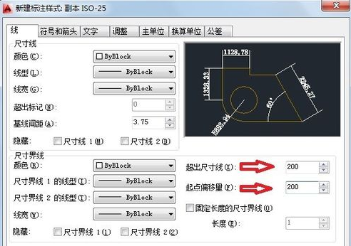 标注样式:快捷键D空格呼出标注样式管理器,点击修改,调整线,符号和箭头,这里也可以调整文字样式。线中超出尺寸线,起点偏移量都设为200,设为建筑标记,箭头为200。置为当前。
