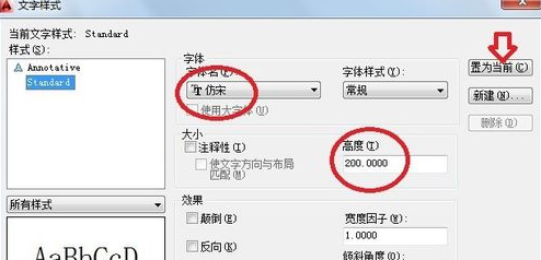 3.调整文字样式:文字样式的快捷键是ST空格。cad图中的文字样式都是有规定的,选择仿宋字体,把字高设为200。并置为当前。
