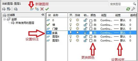 6.图层设置:cad作图必须要有图层设置,这一步很重要,每次开始做之前都要先设置好。LA空格,编辑新图层,可以根据自己的需要创建图层以及图层的标注和颜色。需要用哪一层勾选就行了。