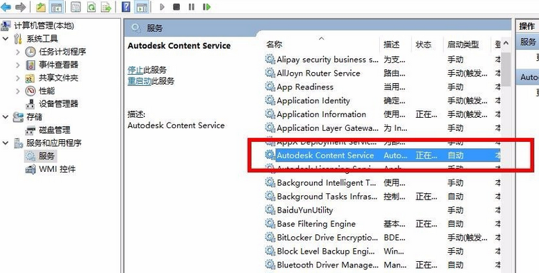 3.然后双击点击右面的 服务。并找到autodesk content service(即我们的要找的内容)