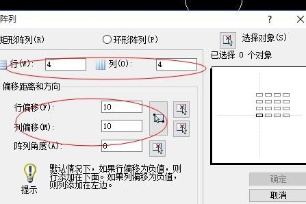 5.然后输入行偏移和列偏移,我输入的是10,最后的图形行列间距都为10。可以不同,按自己需要的设置。