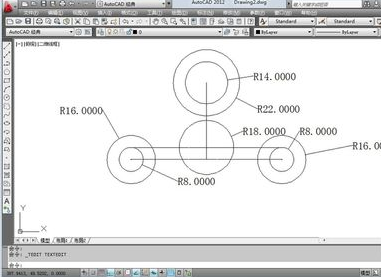 3.输入c快捷键分别在两条直线的端点和交点处画圆,2个半径8的圆,2个半径16的圆,一个半径14的圆,一个18半径的圆,一个22半径的圆,结果如图所示,小编是为了方便教大家才标注半径的,大家不用标哦!