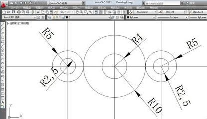 2.输入快捷键C绘制2个半径2.5圆,一个半径4的圆,一个半径5的圆和一个半径10的圆,圆心都是四条辅助线的交点,具体的圆的位置和半径,如图所示。