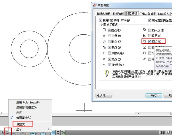 4.点击捕捉设置中的设置,然后弹出对话框草图设置,选择对象捕捉,然后选中切点,如图所示。