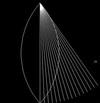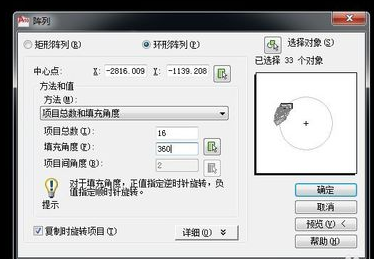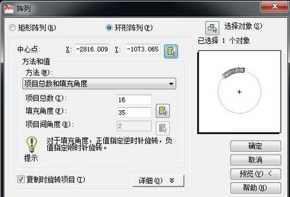4.用ar(阵列)命令,然后选择“环形阵列”,选择对象为步骤3中的直线,中心点为直线最上方点,项目总数为16,填充角度为35°,然后点确定,得到如图所示的阵列图形。