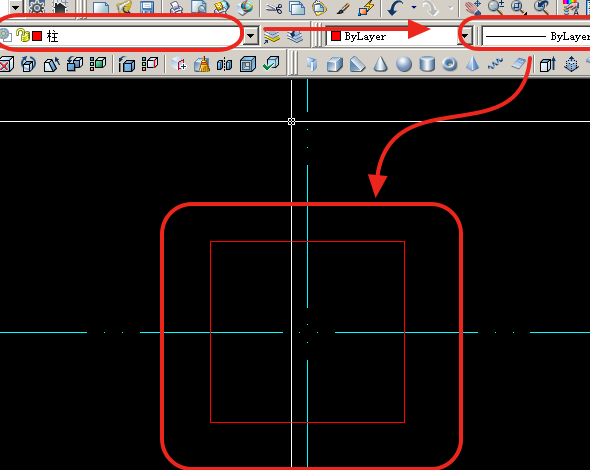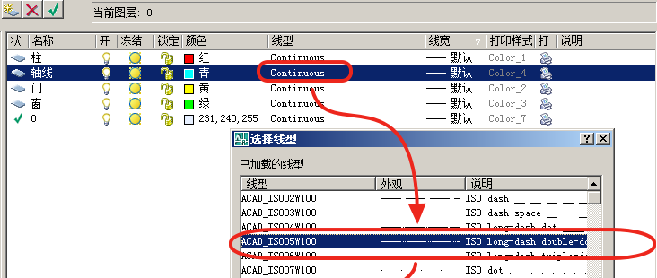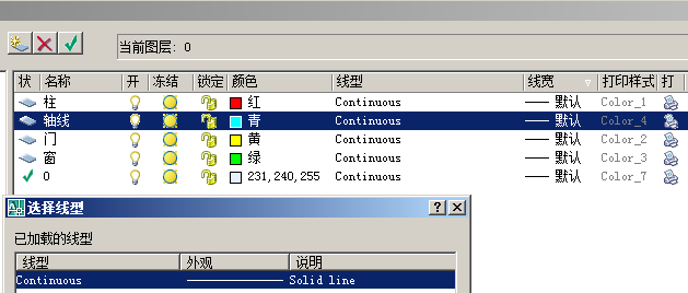 5.如图,轴线我们选择为点划线,其余选择为实现。当然颜色的设置也可以多样化。