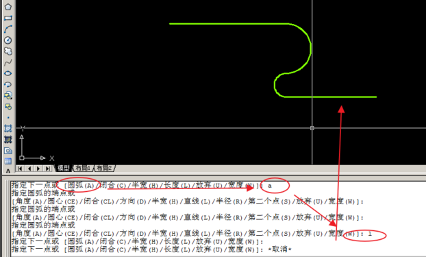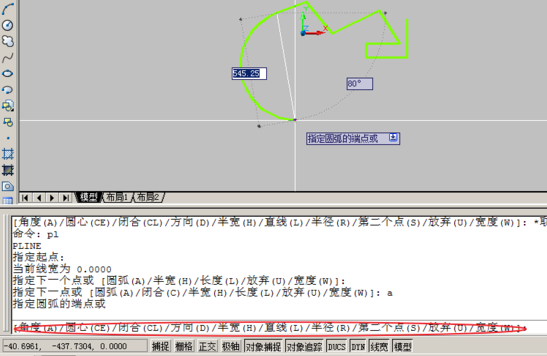 8.使用pline线时,我们也可以采用弦的方式来绘制圆弧。