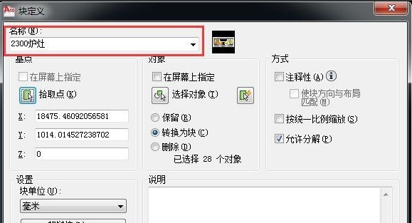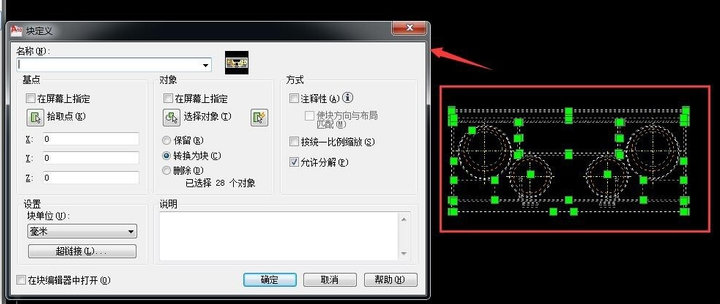 3.下面进行块重组,选择需要组成块的设备零件,然后输入快捷键B,再回车弹出块定义窗口
