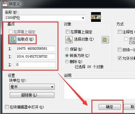 4.输入块名称---然后通过“拾取点”选择块的机电,一般选择设备背面,这个设备在左下角---然后点击确认