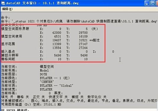 4.然后会弹出一个文本窗口,在 此处可以看到距离上参数。