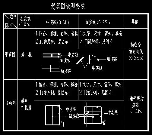 在学习和练习过程中,要记的是线宽和线型的要求,而不是死记硬背这个窗或者那个墙用什么颜色。切记颜色是可以替换货更改的,但线型却是规范中严格要求的,无可替代!!