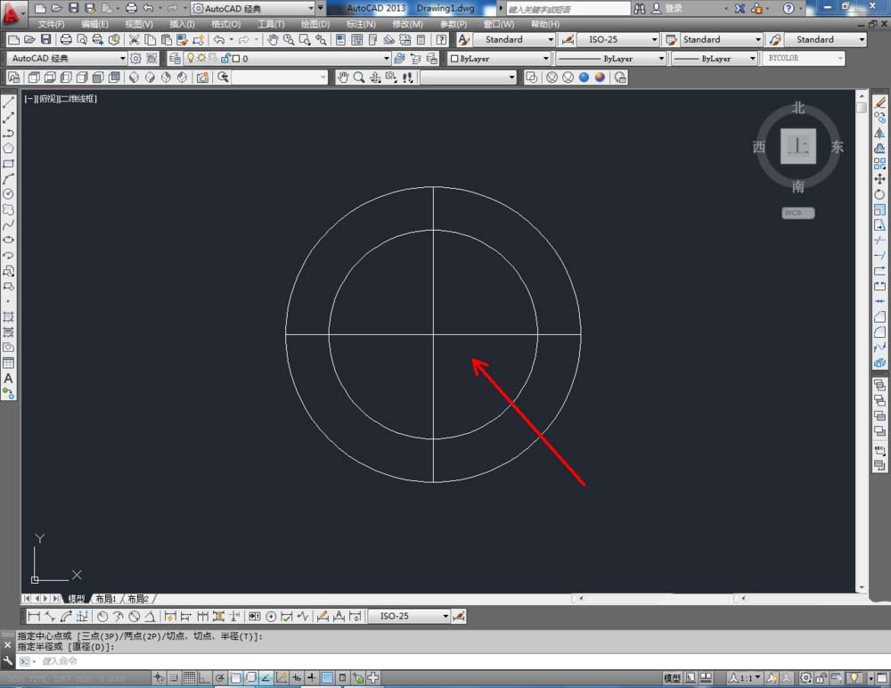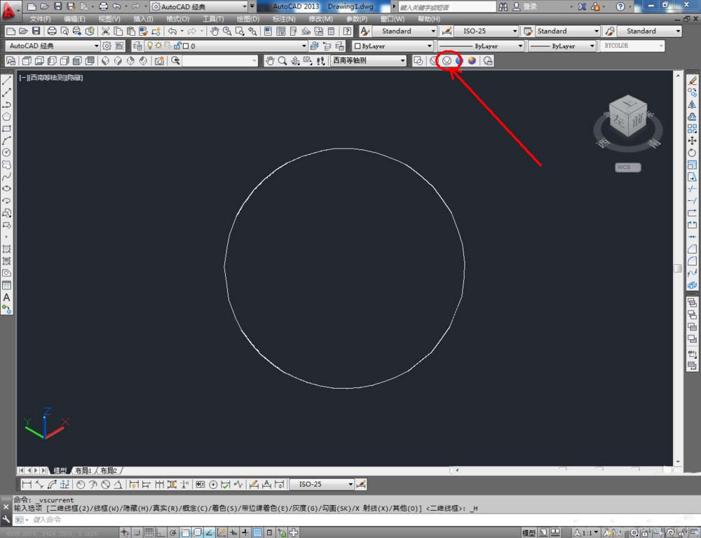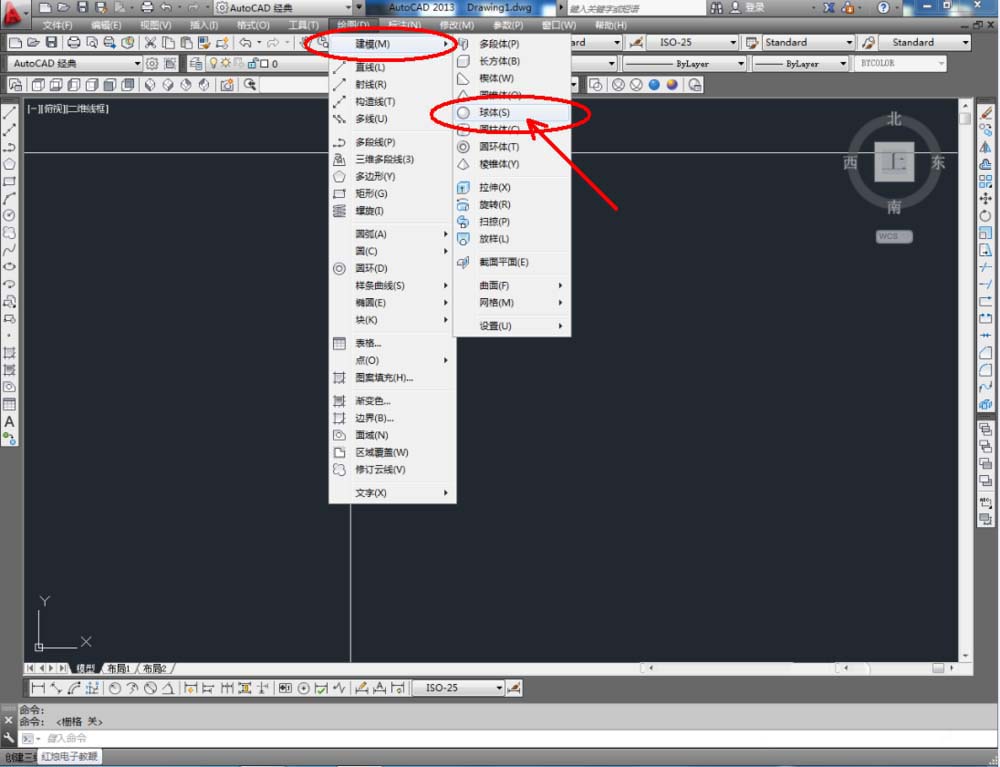 2、点击【绘图】-【建模】-【圆锥体】,按图示在作图区域绘制一个球体模型。完成后,点击视图栏中的【西南等轴测】将视图切换为西南视角并观察球体模型(如图所示);