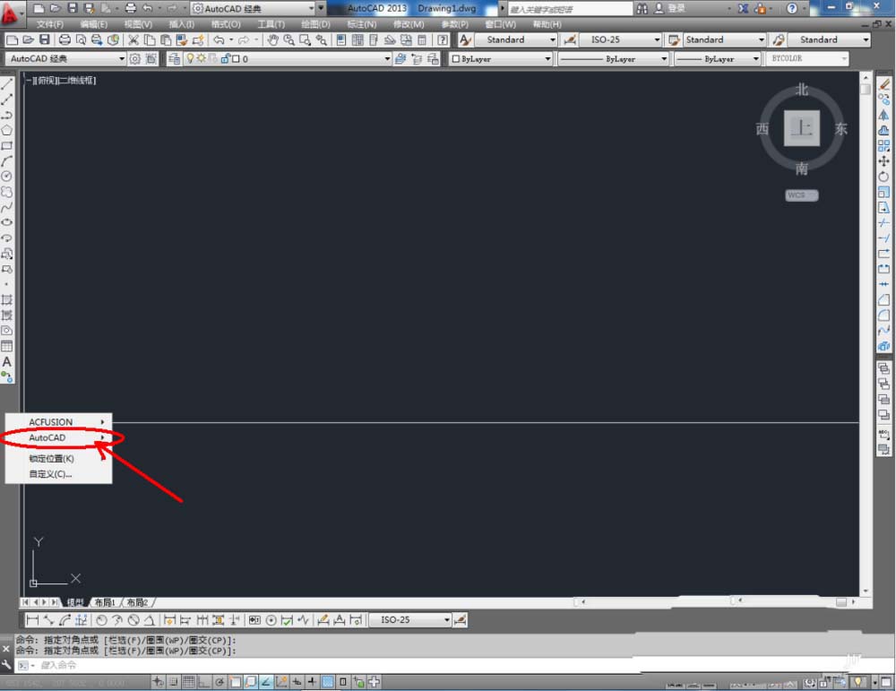 1、打开AutoCAD 2013软件,鼠标移动到图示区域,点击鼠标右键-【AutoCAD】,勾选【视图】、【视觉样式】和【三维导航】,将这三个工具栏调出并按图示调整好工具栏的位置;