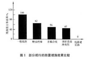 目前,架空送电线路仍采用“堵塞”型的防雷保护思想,所采取的保护措施有:架设避雷线,降低杆塔接地电阻,加强绝缘,采用不平衡绝缘,架设耦合地线,安装线路型避雷器等。这些防雷保护措施均有其优缺点:架设避雷线对减少雷电绕击导线的概率和提高反击耐雷水平有非常重要的作用,但无法完全避免绕击或侧击;降低杆塔接地电阻对减少雷击反击跳闸率有决定性作用,但超过耐雷水平的雷电流仍将引起线路跳闸,且高土壤电阻率地区难以降阻;加强绝缘受杆塔尺寸及投资的限制,无法理想地降低雷击跳闸率;安装线路型避雷器,保护效果极佳,但由于投资巨大、重量重、安装拆卸运输不便、预试不确定因素等原因,难以大面积采用,图1为现行的防雷措施效果比较。