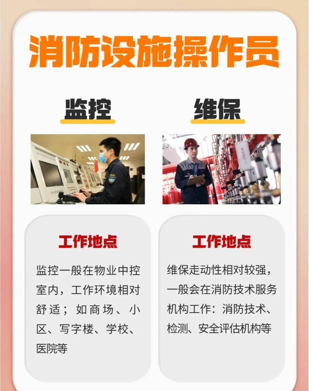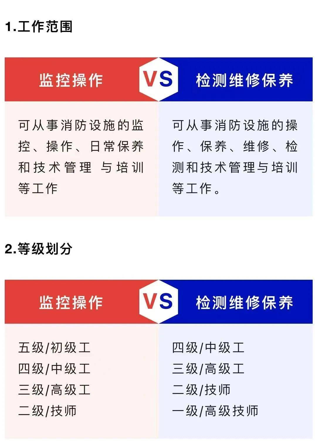 01 监控与维保的区别: 消防设施操作员职业设立了两个职业方向“消防设施监控操作”和“消防设施检测维修保养”。 初级(五级):监控、操作不具备联动控制功能的区域火灾自动报警系统及其他消防设施的人员; 中级(四级)监控:可监控、操作设有联动控制设备的消防控制室的人员(监控值机); 中级(四级)检测维保:从事消防设施检测维修保养的人员(消防技术服务机构)。 02 职业细分 从上图可以看出,消防检测维修保养是没有监控这个工作范围的,因为未来的就业范围主要是到消防服务机构,而消防设施监控操作这个领域将来去的是具体的某一个单位,比如综合楼、大型商场、超市等,都是有自己独立的消防体系。 监控操作是到单位,而检测维修保养是服务于消防服务技术机构。虽然工作范围都有保养,但是监控方向涉及的只是日常保养,而检测维修保养工作方面要高一个层次。 一、监控和维保哪个含金量高? 消防监控和维保是消防设施操作员的两个职业方向,含金量是一样的,监控操作可从事消防设施的监控、操作、日常保养和技术管理与培训等工作;维修保养可从事消防设施的操作、保养、维修、检测等工作。 两者没有什么好坏之分,主要是看个人更想从事哪个方向的事情,消防设施操作员监控方向就更多的坐在监控室里,工作环境会比较舒适,更推荐女性朋友选择监控方向。想学一技之长的就选维保方向,技术岗位永远不会失业。 二、监控和维保哪个更实用? 中控方向。消防设施操作员监控室内的工作人员可以实时监测和控制单位区域内的消防设施运行状态,及时处理各种突发情况,确保消防安全。中控方向的工作相对来说更加繁忙紧张,但是对于那些追求刺激和挑战的人来说,这也会是一个充满乐趣的工作方向。 维保方向。消防设施操作员维保方向的工作内容主要是维修消防设施和消防设备的运行安全保障工作。维保工作相对来说更注重实际技能和经验积累,需要对各种消防设备及其使用方法有精深的了解和掌握。与中控相比,维保工作可能更注重细节和耐心,但是收益比较稳定。 三、就业前景 1)监控方向 消防控制室值守也就是监控方向,工作范围包括消防设施的监控、操作、日常保养和技术管理培训等,相对来说,工作内容上还是比较轻松的,但是监控室嘛,监控操作的设备又都是消防设施,容不得一点疏忽,所以需要24小时值守。消防条例规定,消防控制室要不少于6人,每次值班人数不少于2人,且均需要消防设施操作员国家职业资格证书持证上岗。 以下单位,均设置有消防控制室,自然也需要大量的消防设施操作员。 (一)商场(市场)、宾馆(饭店)、体育场(馆)、会堂、公共娱乐场所等公众聚集场所(统称公众聚集场所); (二)医院、养老院和寄宿制学校、托儿所、幼儿园; (三)国家机关; (四)广播电台、电视台和邮政、通信枢纽; (五)客运车站、码头、民用机场; (六)公共图书馆、展览馆、博物馆、档案馆以及具有火灾危险性的文物保护单位; (七)发电厂(站)和电网经营企业; (八)易燃易爆化学物品生产、储存、供应、销售单位; (九)服装、制鞋等劳动密集型生产、加工企业; (十)重要的科研单位; (十一)其他发生火灾可能性较大以及一旦发生火灾可能造成重大人身伤亡或者财产损失的单位: (十二)物业服务公司。 2)检测维保方向 消防维保、检测也就是我们常说的维保方向,工作范围有消防设施的操作保养、维修、检测、技术管理和培训。跟监控方向相比,维保更侧重技术性,工作内容比较复杂繁琐,强度也比较大。但相对的,维保并不需要像监控那样全天候值守,只需要定期巡查、维护即可。虽然经常出外勤,可相对的,薪资待遇上也会高上一些,这对个人以后的发展也是很有帮助的一个过程。 三、证书区别 职业方向体现不同:如下图