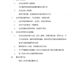 介绍: 台风应急领导小组职责:对实情的预防督促检查事故善后处理工作。 台风应急人员职责:具体负责实情,紧急情况的应急快速反应工作。 二、台风可能危害的地方、产生的原因、性质和后果 1、台风可能危害的地方:生活区、料场及停车场; 2、台风产生的原因:气候影响; 3、台风危害的性质和后果:造成财产损坏。