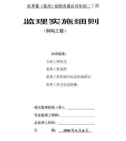 红苹果(苏州)纺织有限公司车间钢结构工程监理实施细则