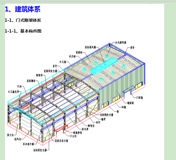 介绍: 力学原理: 门式刚架结构以柱、梁组成的横向刚架为主受力结构,刚架为平面受力体系。为保证纵向稳定,设置柱间支撑和屋面支撑。 刚架: 刚架柱和梁均采用截面H型钢制作,各种荷载通过柱和梁传给基础。 支撑、系杆 刚性支撑采用热轧型钢制作,一般为角钢。柔性支撑为圆钢。系杆为受压圆钢管,与支撑组成受力封闭体系。 屋面檩条、墙梁 一般为C型钢、Z型钢。承受屋面板和墙面板上传递来的力,并将该力传递给柱和梁。