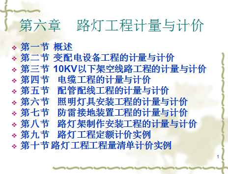介绍: 夜景照明包括道路照明和环境装饰照明两类。路灯是城市环境中反映道路特征的照明装置,为夜间交通提供照明之便,装饰照明则侧重于艺术性、装饰性、利用各种光源的直射和漫射,灯具的造型和各种色彩有点缀,形成和谐而又舒适的光照环境,使人们得到美的享受。 路灯变配电设备工程主要包括:杆上变压器安装、地上变压器安装、组合型成套箱式变电站安装、电力电容器的安装、高低压配电柜及配电箱、避雷器安装,熔断器、控制器(屏)、启动器、开关(隔离、负荷、限位、照明)安装、线缆断线报警装置,铁构件制安、接线端子焊压安装。 配电设备的选择,应考虑所在市区的地理情况及环境条件,通过技术经济比较,优先选用占地少的配电设备型式,配电设备的安装位置应位于运行方便、电缆较短,朝向良好和便于观察的地方。 路灯变压器安装用的枕木、绝缘导线、石棉布是按一定的折旧率摊销的,实际摊销量与定额不符时不得换算。路灯变压器可以采用油浸式、干式气体绝缘式,还有箱式变电站。