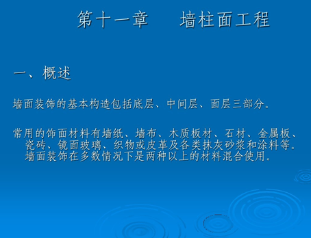 介绍: 墙面装饰的基本构造包括底层、中间层、面层三部分。常用的饰面材料有墙纸、墙布、木质板材、石材、金属板、瓷砖、镜面玻璃、织物或皮革及各类抹灰砂浆和涂料等。墙面装饰在多数情况下是两种以上的材料混合使用。 定额中凡砂浆的厚度、种类、配合比及装饰材料的品种、型号、规格、间距等设计与定额不同是,可按设计规定调整。