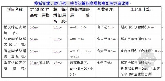 1、模板支撑高度超高:定额取定高度3.6m,以支撑最大高度每超过1m(含不足1m)计1个增加层;