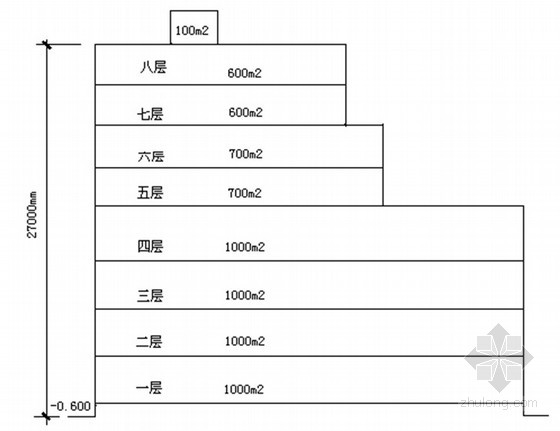 〖例〗某建筑物檐高27m,8层,塔吊施工,总建筑面积6700m2,其中l~4层为每层1000m2,层高3.6m,5、6层为每层700m2,7、8层为每层600m2,层高均为3m。电梯机房100m2,室外设计地面标高为-0.6m,计算垂直运输费。