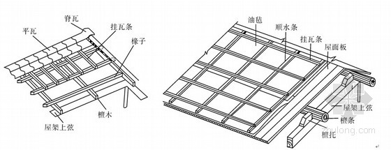 (1)屋面木基层:是指坡屋面防水层(瓦)的基层,用以固定和承受防水材料。它由一系列木构件组成,故称木基层。包括屋面板、椽板、油毡、挂瓦条、顺水条。