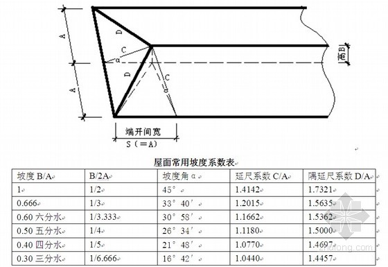 (3)延尺系数C:等于三角形屋架的上弦長与半跨之比,也等于斜坡面的面积与其水平投影面积之比