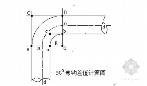 90o弯钩外皮(包)度量差值=90o弯钩中心线圆弧长-90o弯钩外皮(包)线度量长