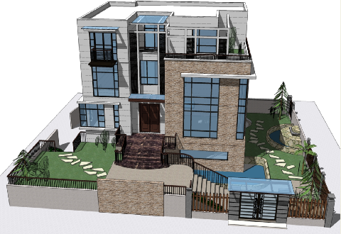 介绍: 本项目用地面积442平方米,建筑首层150平方米,4层,11.63米高,一楼车库(2个车位)兼棋牌室,2楼大厅、客厅、厨房,3、4楼书房,卧室套房,空中花园。外立面用大量玻璃与栅格点缀,尽显现代风格。庭院地势高低错落,树木葱葱,伴以鱼池带活整个庭院。