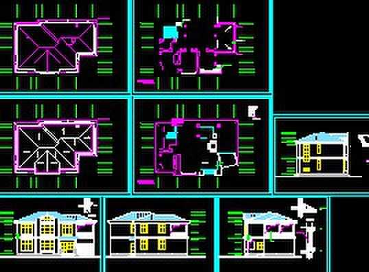 介绍: 农村民居施工图包括天沟详图、一层平面图、二层平面图、三层平面图、立面图、剖面图
