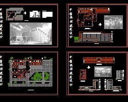 介绍: 中型旅馆设计方案图包括总平面、二层平面图、南立面图、一层平面图、1-1主门厅剖面图、东立面图、客房详图